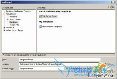 · 在"New Project"对话框内,从"Visual Basic"树的"Project Type"下选择"database"并选择"SQL Server Project"作为模板,输入名字"SampleAllInOne"。至此,该对话框应该看起来如下图6所示。