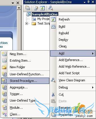 · 使用"Solution explorer",右击"SampleAllInOne"工程,并点击"Add->Stored Procedure"(以创建一个新的存储过程)(图9)。
