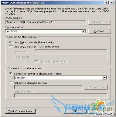 · 一旦你点击"OK",将出现一个"New Database Reference"对话框。输入你自己的实例名,并选择数据库"Sample"(在上一节创建的),并且测试连接(图7)。
