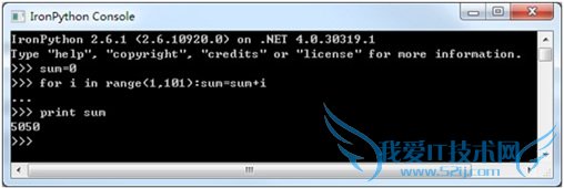 举个简单的例子,图 2所示为使用IronPython[2]编程计算“1+2+……+100”的屏幕截图,我们可以快速地输入一段完成累加求和的代码,然后马上就可以看到结果: