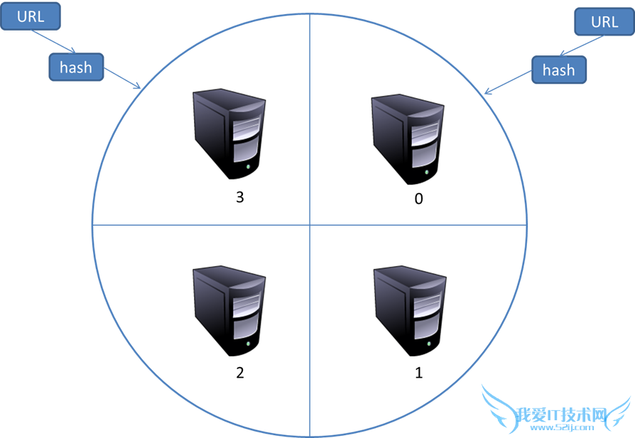 这种模式有一个问题,当有一台服务器死机或者添加新的服务器,那么所有URL的哈希求余的结果就都要变化。也就是说,这种方式的扩展性不佳。针对这种情况,又有一种改进方案被提出来。这种改进的方案是一致性哈希法来确定服务器分工。其基本结构如图所示: