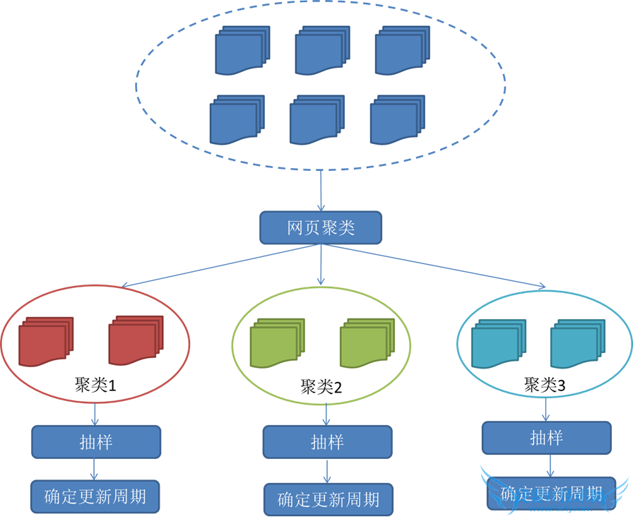 这种策略认为,网页具有很多属性,类似属性的网页,可以认为其更新频率也是类似的。要计算某一个类别网页的更新频率,只需要对这一类网页抽样,以他们的更新周期作为整个类别的更新周期。基本思路如图: