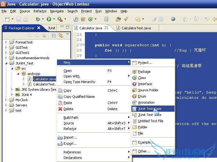 第三步,生成JUnit测试框架:在Eclipse的Package Explorer中用右键点击该类弹出菜单,选择“New à JUnit Test Case”。如下图所示: