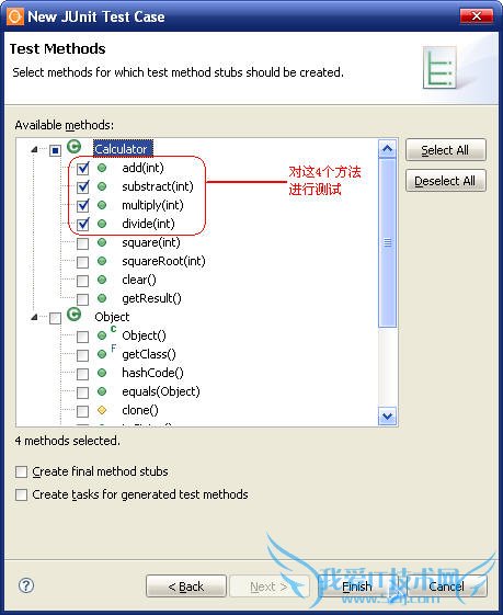 点击“下一步”后,系统会自动列出你这个类中包含的方法,选择你要进行测试的方法。此例中,我们仅对“加、减、乘、除”四个方法进行测试。如下图所示: