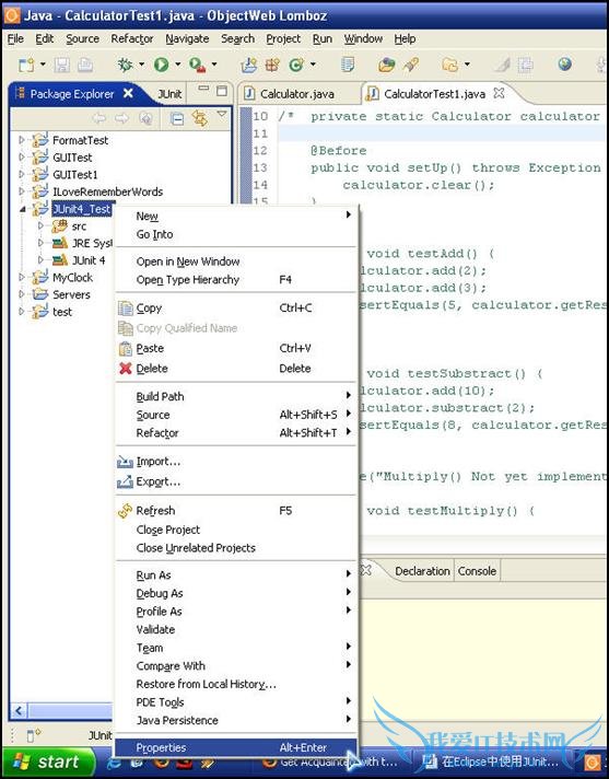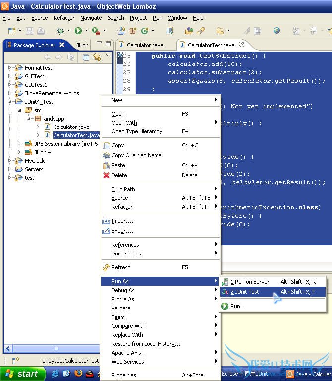 第四步,运行测试代码:按照上述代码修改完毕后,我们在CalculatorTest类上点右键,选择“Run As à JUnit Test”来运行我们的测试,如下图所示:
