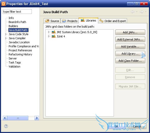 在弹出的属性窗口中,首先在左边选择“Java Build Path”,然后到右上选择“Libraries”标签,之后在最右边点击“Add Library…”按钮,如下图所示: