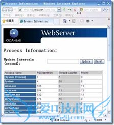 除了上述要求之外,是否能够快速、方便的生成动态页面是衡量一个嵌入式web服务器的重要指标。GoAhead提供了多种方法编写动态页面,包括asp过程、GoForms过程和embedded JavaScript。GoAhead主要利用asp过程动态获取系统信息然后显示在页面上,GoForms过程则主要用来处理用户指令,例如控制设备和修改配置等。下面以一个动态显示系统当前正在运行的进程信息的小型web应用程序为例,阐述如何利用GoAhead构建嵌入式web应用程序,特别是asp和GoForms过程的使用方法。
