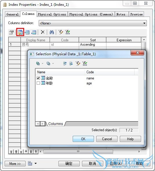 选择Columns选项卡→单击Add Columns图标按钮→选择要建立索引的字段→确定