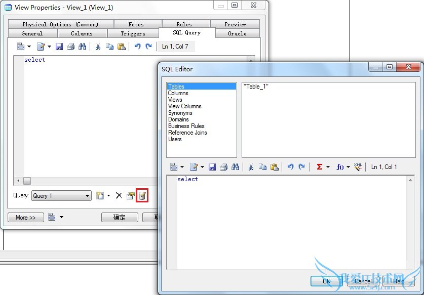 切换到SQL Query选项卡,在文本框中可以设置定义视图的sql查询语句,在定义视图时最好不要使用*,而应该使用各个需要的列名,这样在视图属性的Columns中才能看到每个列。单击右下角Edit with SQL Editor按钮,即可弹出SQL Editor编辑器,编写SQL语句。也可采用其他sql语句生成器生成sql语句。