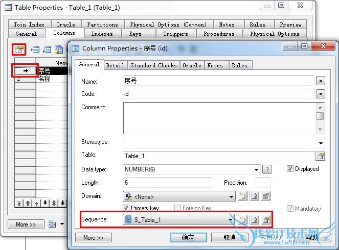 双击表打开属性窗口→勾选P主键复选框→双击设置为主键的字段(在行的头部双击)或者单击上方的属性图标按钮→在打开的窗口下方(注意不同数据库不一样,sql server是identity复选框)选择sequence,如果没有则单击旁边的新建按钮创建一个sequence。
