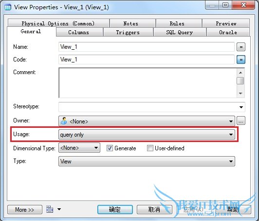 工具栏中单击视图(view)按钮→创建视图→双击视图打开属性窗口,其中Usage是表示视图是只读的还是可更新的。如果我们只创建一般的视图,那么选择query only选项即可。