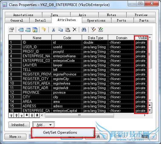 双击生成的某张表的类图打开属性窗口→选中全部字段→将字段Visibility全部改为private→单击下方Add...按钮→选择Get/Set Operations→确定