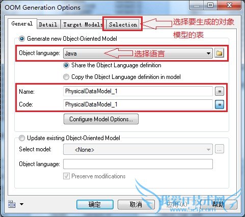 tools→Generate Object-Oriented Model...→选择语言→修改Name和Code→(Selection选项卡→选择要生成对象模型的表)→确定