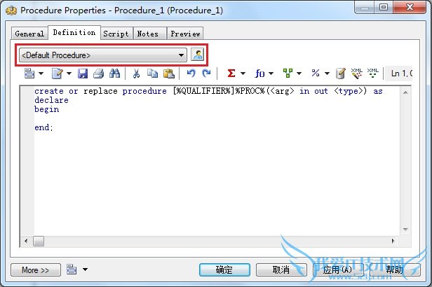 工具栏中单击Procedure按钮→创建存储过程→双击存储过程打开属性窗口→选择Definition选项卡,其中在下拉列表框中,有Default Procedure、Default Function这两个选项,前者是定义过程,后者是定语函数,系统会根据选择的类型创建SQL语句的模板→编辑存储过程脚本。
