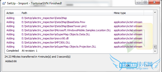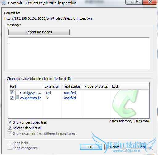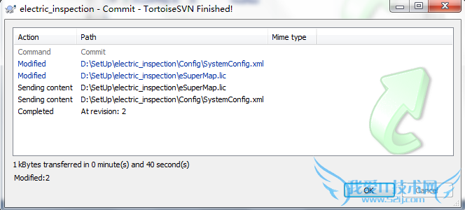 我们在electric_inspection添加eSuperMap.lic,在electric_inspection文件下的空白处点击右键,点击SVN Commit…,和上面讲的提交改过的文件到SVN服务器一样,就可以了,另外也可以在文件eSuperMap.lic上点击右键,点击TortoiseSVN,这样并没有将这个文件提交到SVN服务器,只是将这个文件标记为源代码库中的文件,并将其状态设置为修改状态。之后,我们要再SVN Commit这个文件一次,才能将其真正提交到SVN服务器上的代码库中。类似添加文件夹也是一样。