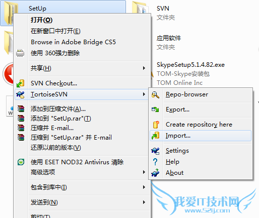 假设我们使用Visual Studio在文件夹SetUp中创建一个项目,我们要把这个项目的源代码签入到SVN Server上的代码库中,首先右键点击SetUp文件夹,右键菜单如下: