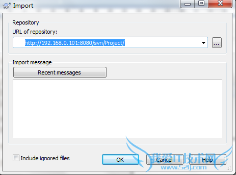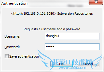 其中http://192.168.0.101/为服务器的IP地址,svn是代码仓库的根目录,Project是我们添加的代码库,右下角的Checkbox在第一次添加的时候没有用,以后签入时可选择忽略的文件,点击OK。弹出下面窗体,要求输入凭证