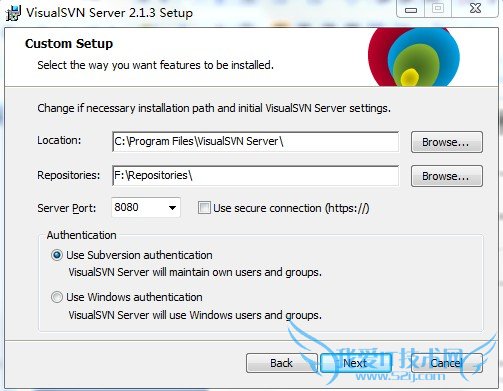 注意:location :为安装文件位置,Repositories:为管理的代码仓库的位置,若选中Use secure connection前面的Checkbox,则表示安全连接【https】,这里的端口有433/8433可用,若未选中Checkbox,默认端口80/81/8080,身份认证选择Subversion。