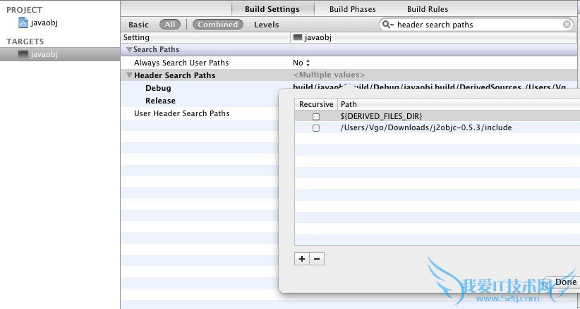 (8) 在Header Search Paths 中添加 "$distribution-path/include", 接着添加 "${DERIVED_FILES_DIR}".将$distribution-path改为下载解压的j2objc 0.5.3的路径。