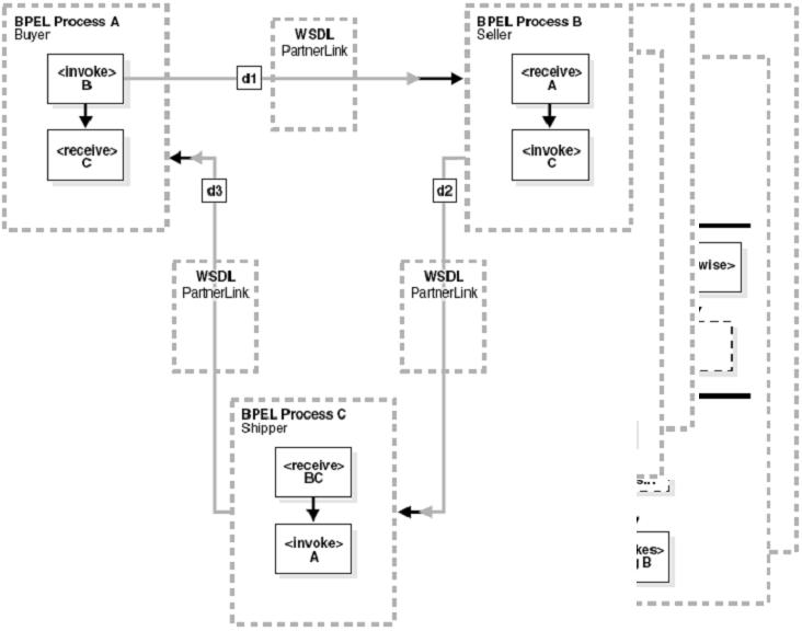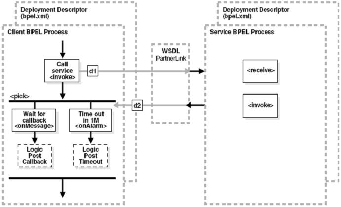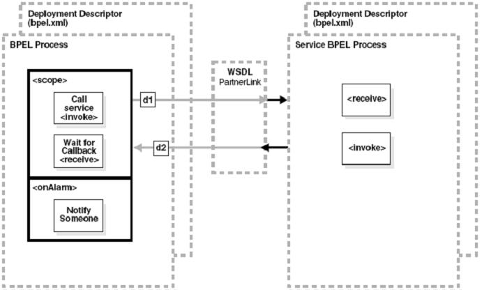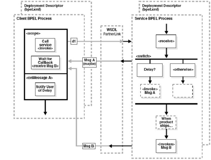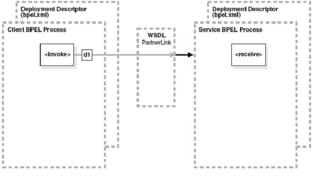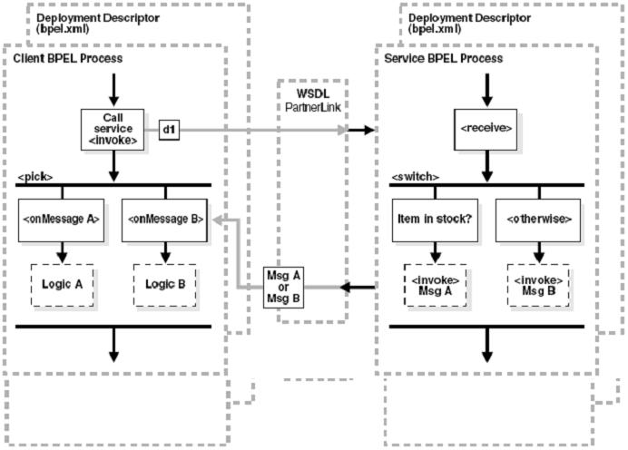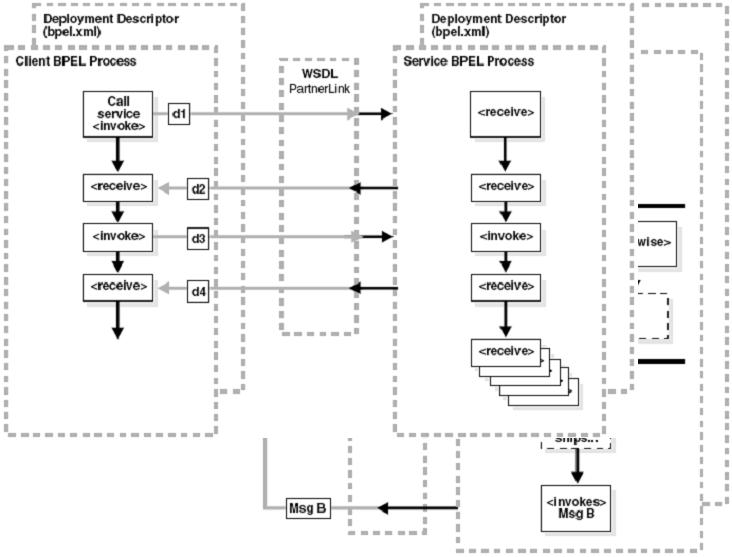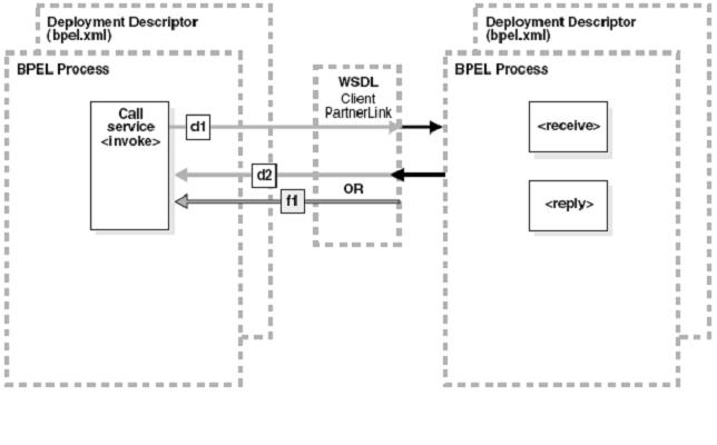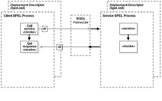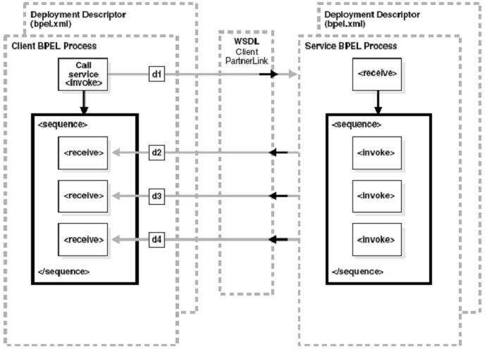 右边被调用方的 BPEL定义中使用Receive Activity接收请求,使用Invoke Activity发送响应。