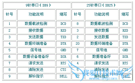 由图2可以看出,在9针串口接头中,公头和母头的管脚定义顺序是不一样,这一点需要特别注意。那么,这些管脚都有什么作用呢?9针串口和25针串口常用管脚的功能说明如图3所示。