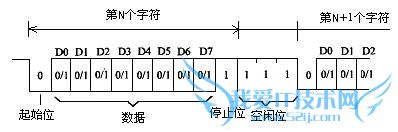(5)空闲位:空闲位是指从一个字符的停止位结束到下一个字符的起始位开始,表示线路处于空闲状态,必须由高电平来填充。