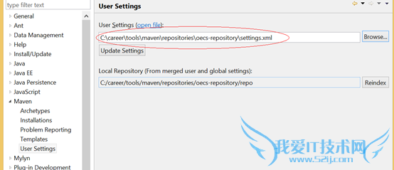 配置eclipse仓库settings.xml文件地址,由于我们在settings.xml文件里配置了仓库的路径,这里配置之后,eclipse会去读取settings.xml里面的内容: