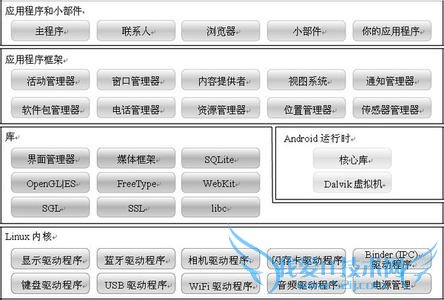 我们看一下另一层,内核之上是许多C/C++库,比如OpenGL、WebKit、FreeType、SSL(Secure SocketsLayer,安全套接字层)、libc (C运行时库),SQLite和媒体。基于BSD (Berkeley Sofiware Distribution,伯克利软件套件)的系统C库针对嵌入式Linux设备进行了调优(大小约为原始大小的一半).媒体库基于PacketVideo(www.packetvideo.com/)的OpenCORE。这些库负责录制和播放音频和视频格式的内容。一个名为Surface ManagertYJ库控制对显示系统的访问,支持2D和3D。在新版本中可能添加更多这样的本地库。