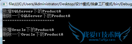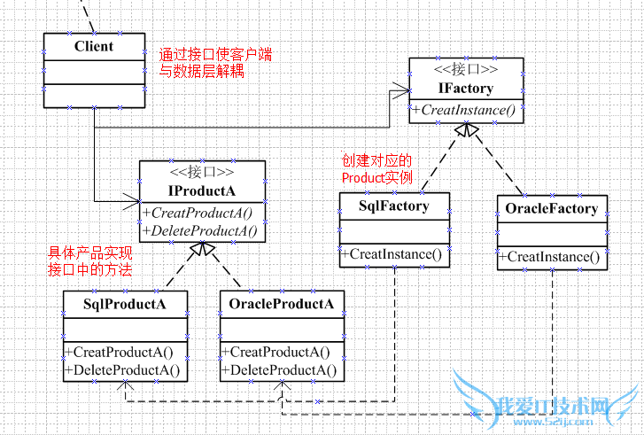 优点:易于更改产品类型 如 可以很方便的更改SqlFactory 与OracleFactory,另外使得客户端于业务层分离,客户端所接触的都是IProductA 和IFactory