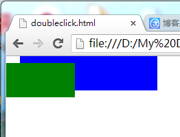 1 <!DOCTYPE html> 2 <html> 3 <head> 4 <style type="text/css"> 5 div{position: absolute;top: 0;left: 0;height: 50px} 6 #back{background-color: blue;left: 20px;width: 200px;z-index: 0} 7 #front{background-color: green;top:10px;width: 100px;z-index: 1} 8 </style> 9 </head> 10 <body> 11 <div id="back"></div> 12 <div id="front"></div> 13 <script type="text/javascript"> 14 document.getElementById("back").addEventListener("click", function () { 15 console.log("back clicked"); 16 }) 17 document.getElementById("front").addEventListener("click", function () { 18 console.log("front clicked"); 19 this.setAttribute("style", "z-index:0"); 20 document.getElementById("back").setAttribute("style", "z-index:1"); 21 }) 22 document.getElementById("back").addEventListener("dblclick", function () { 23 console.log("back double clicked"); 24 }) 25 document.getElementById("front").addEventListener("dblclick", function () { 26 console.log("front double clicked"); 27 }) 28 </script> 29 </body> 30 </html>