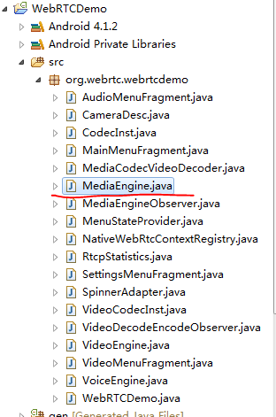 2、WebRTCDemo中音视频管理接口--MediaEngine,包括操作音频和视频的接口,详见MediaEngine的实现。