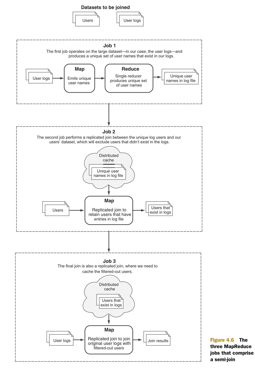 图4.6说明了在半连接中将要执行的三个MapReduce作业(Job)。