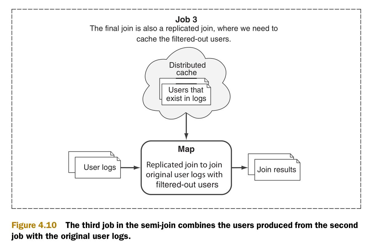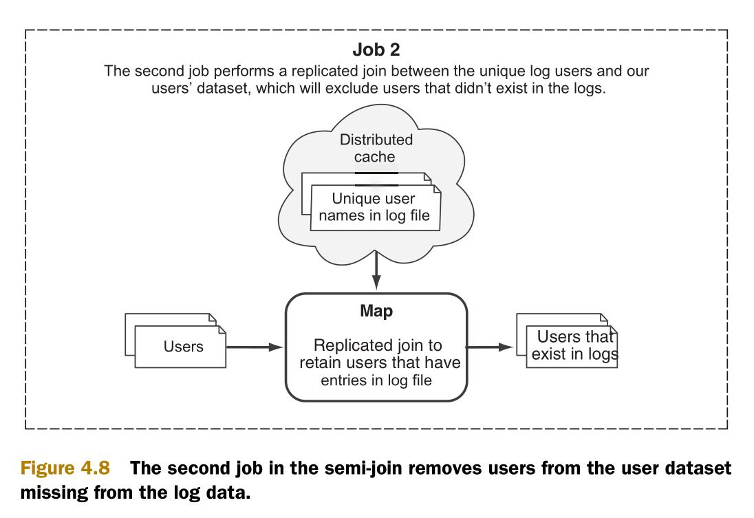 在最后一步中,需要将作业2生成的已过滤的用户集和原始的用户日志合并了。表面上,已过滤的用户集是足够小到可以放到内存中,同样也可以放到分布式缓存中。图4.10说明了这个作业的流程: