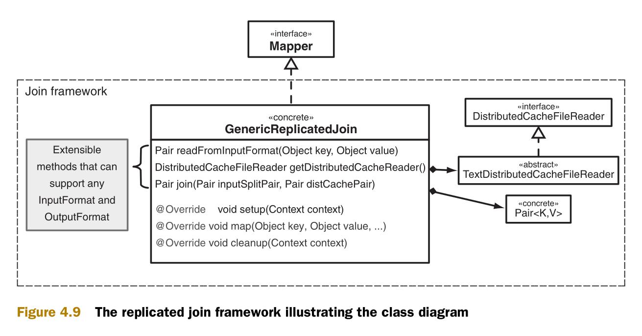 现在是个不错的时间去熟悉一下附录D中的复制连接框架。这个框架对KeyValueTextInputFormat和TextOutputFormat提供了内置支持,并假设 KeyValueTextInputFormat生成的键是连接键。同时,这也是数据被展开的过程。图4.9是这个框架的类图:
