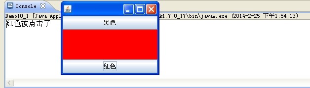 1 /** 2 * 事件处理机制:委派事件模型.指当事件发生的时候,产生事件的对象(事件源),会把此 3 * "消息"传递给"事件的监听者"的一种处理方式,而这里的"信息"指java.awt.event事件类库种 4 * 某个类创建的对象. 在java种,消息 是一种事件对象. 5 * 6 * 7 * 事件源-----事件(一个事件对象)----->事件监听者[事件处理方法] 8 */ 9 package com.test3; 10 import java.awt.*; 11 import javax.swing.*; 12 13 import java.awt.event.ActionEvent; 14 import java.awt.event.ActionListener; 15 public class Demo9_3 extends JFrame implements ActionListener{ 16 JPanel mp = null; 17 JButton jb1=null,jb2=null; 18 public static void main(String[] args) { 19 Demo9_3 demo9_3 = new Demo9_3(); 20 } 21 public Demo9_3(){ 22 mp = new JPanel(); 23 jb1 = new JButton("黑色"); 24 jb2 = new JButton("红色"); 25 26 this.add(jb1,BorderLayout.NORTH); 27 mp.setBackground(Color.black); 28 this.add(mp); 29 this.add(jb2,BorderLayout.SOUTH); 30 Cat myCat1 = new Cat(); 31 32 //注册监听 对象->实例.实例监听. 33 jb1.addActionListener(this); 34 jb1.addActionListener(myCat1); 35 //指定action命令.如果jb1被点击,黑色command被传递. 36 jb1.setActionCommand("黑色"); 37 38 jb2.addActionListener(this); 39 jb2.setActionCommand("红色"); 40 41 this.setSize(200,150); 42 this.setDefaultCloseOperation(JFrame.EXIT_ON_CLOSE); 43 this.setVisible(true); 44 } 45 //事件处理方法 46 @Override 47 public void actionPerformed(ActionEvent e) { 48 // System.out.println("ok"); 49 //判断是哪个按钮被点击 50 if(e.getActionCommand().equals("黑色")){ 51 System.out.println("黑色被点击了"); 52 mp.setBackground(Color.black); 53 }else if(e.getActionCommand().equals("红色")){ 54 System.out.println("红色被点击了"); 55 mp.setBackground(Color.red); 56 } 57 } 58 } 59 60 class Cat implements ActionListener{ 61 62 @Override 63 public void actionPerformed(ActionEvent e) { 64 if(e.getActionCommand().equals("黑色")){ 65 System.out.println("猫猫知道你按下黑色按钮了"); 66 }else if(e.getActionCommand().equals("红色")){ 67 System.out.println("猫猫知道你按下红色按钮了"); 68 } 69 } 70 71 }