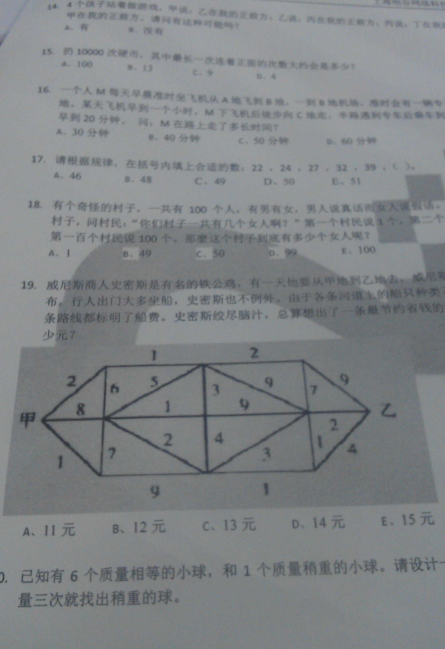 20.最后一题可能没有拍完,讲的是 6个质量相等的小球和1个质量稍重的球,不能用天平,只能用称,设计一种方法,只能量三次就找出稍重的球。