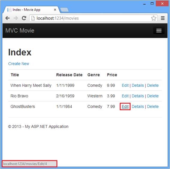 您还可以使用QueryString来传递操作方法的参数。例如,URL: http://localhost:xxxxx/Movies/Edit?ID=3还会将参数ID为 3的请求传递给Movies控制器的Edit操作方法。