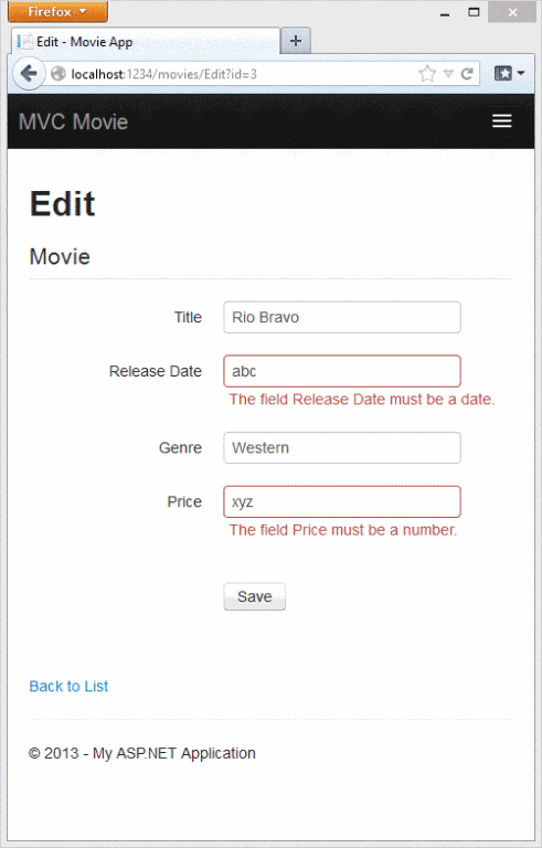 <form action="/movies/Edit/4" method="post"> <input name="__RequestVerificationToken" type="hidden" value="UxY6bkQyJCXO3Kn5AXg-6TXxOj6yVBi9tghHaQ5Lq_qwKvcojNXEEfcbn-FGh_0vuw4tS_BRk7QQQHlJp8AP4_X4orVNoQnp2cd8kXhykS01" /> <fieldset class="form-horizontal"> <legend>Movie</legend> <input data-val="true" data-val-number="The field ID must be a number." data-val-required="The ID field is required." id="ID" name="ID" type="hidden" value="4" /> <div class="control-group"> <label class="control-label" for="Title">Title</label> <div class="controls"> <input class="text-box single-line" id="Title" name="Title" type="text" value="GhostBusters" /> <span class="field-validation-valid help-inline" data-valmsg-for="Title" data-valmsg-replace="true"></span> </div> </div> <div class="control-group"> <label class="control-label" for="ReleaseDate">Release Date</label> <div class="controls"> <input class="text-box single-line" data-val="true" data-val-date="The field Release Date must be a date." data-val-required="The Release Date field is required." id="ReleaseDate" name="ReleaseDate" type="date" value="1/1/1984" /> <span class="field-validation-valid help-inline" data-valmsg-for="ReleaseDate" data-valmsg-replace="true"></span> </div> </div> <div class="control-group"> <label class="control-label" for="Genre">Genre</label> <div class="controls"> <input class="text-box single-line" id="Genre" name="Genre" type="text" value="Comedy" /> <span class="field-validation-valid help-inline" data-valmsg-for="Genre" data-valmsg-replace="true"></span> </div> </div> <div class="control-group"> <label class="control-label" for="Price">Price</label> <div class="controls"> <input class="text-box single-line" data-val="true" data-val-number="The field Price must be a number." data-val-required="The Price field is required." id="Price" name="Price" type="text" value="7.99" /> <span class="field-validation-valid help-inline" data-valmsg-for="Price" data-valmsg-replace="true"></span> </div> </div> <div class="form-actions no-color"> <input type="submit" value="Save" class="btn" /> </div> </fieldset> </form>