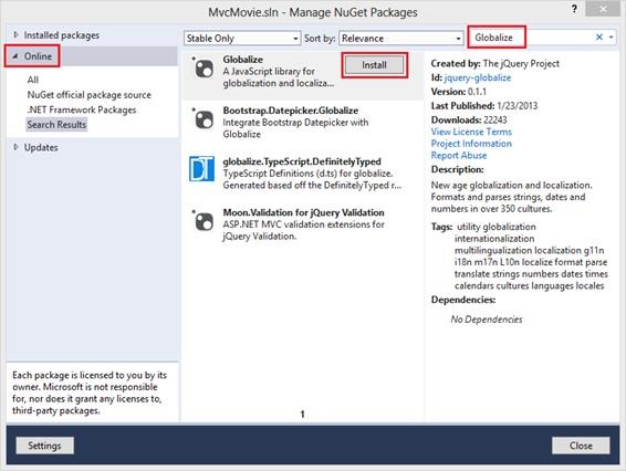 点击安装(Install). JavaScript脚本 \jquery.globalize\globalize.js 文件将会添加到您的当前工程下. 脚本\jquery.globalize\cultures\ 文件夹的下面会包含很多不同文化的JavaScript文件