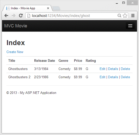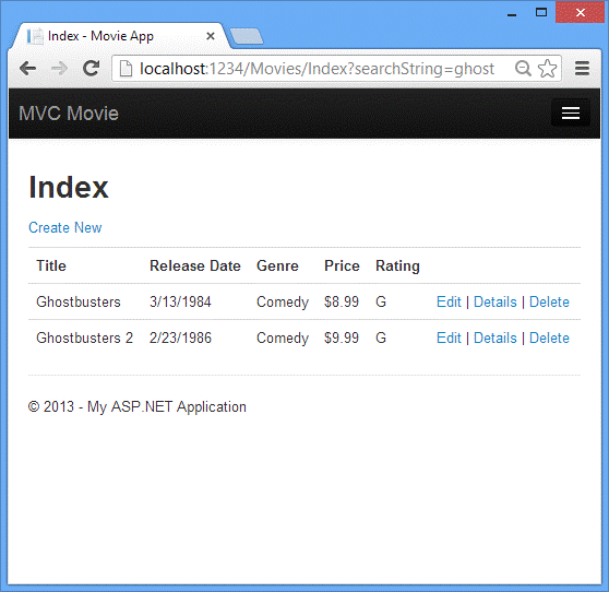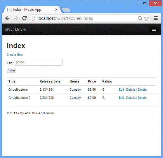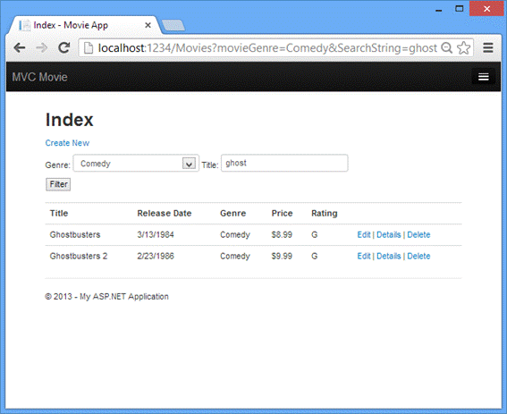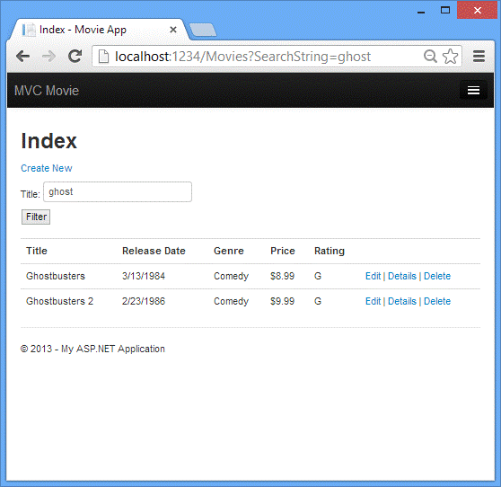 运行这个应用程序和导航到 /Movies/Index。追加一个查询字符串,URL如 ?searchString=ghost。筛选的影片会被显示。