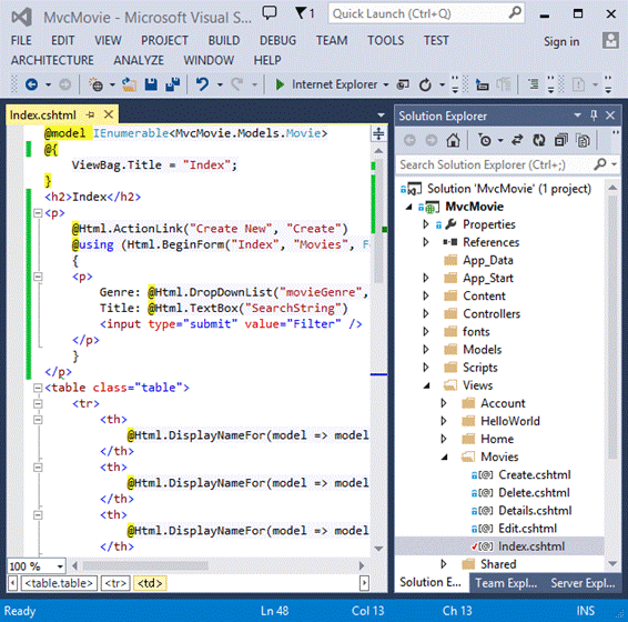 @model IEnumerable<MvcMovie.Models.Movie> @{ ViewBag.Title = "Index"; } <h2>Index</h2> <p> @Html.ActionLink("Create New", "Create") @using (Html.BeginForm("Index", "Movies", FormMethod.Get)) { <p> Genre: @Html.DropDownList("movieGenre", "All") Title: @Html.TextBox("SearchString") <input type="submit" value="Filter" /> </p> } </p> <table class="table">