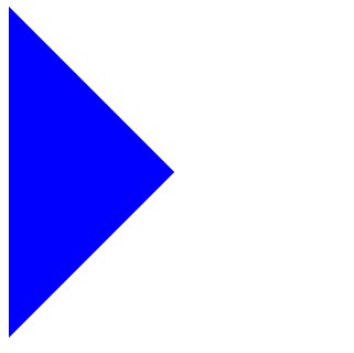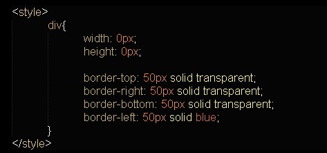 1 <!DOCTYPE html PUBLIC "-//W3C//DTD XHTML 1.0 Strict//EN" "http://www.w3.org/TR/xhtml1/DTD/xhtml1-strict.dtd"> 2 <html xmlns="http://www.w3.org/1999/xhtml" lang="zh-CN"> 3 <head> 4 <title>new</title> 5 <meta http-equiv="Content-Type" content="text/html; charset=utf-8" /> 6 <meta name="description" content="Akira.Juggling" /> 7 8 <style> 9 div{ 10 width: 0px; 11 height: 0px; 12 13 border-top: 50px solid transparent; 14 border-right: 50px solid transparent; 15 border-bottom: 50px solid transparent; 16 border-left: 50px solid blue; 17 } 18 </style> 19 20 </head> 21 <body> 22 <div></div> 23 </body> 24 </html>