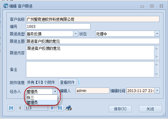 在我开发的CRM系统中,系统的一些用户如经办人员,来自权限管理系统,因此在开发的时候,并没有模拟太多的用户,因此,开始的设计处理是通过下拉列表列出相关的用户即可,如下所示。