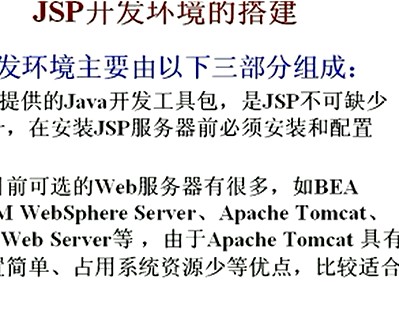 jsp视频教程下载第四讲 :继续讲解关于JSP、ASP以及PHP之间的比较,在比较的过程中,让读者能够体会各种不同的开发语言在web前端的优缺点,同时还介绍了JSP开发环境...