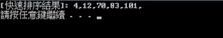 /** * Program name: quick_sort.c * Description: 快速排序法 * Created date: 2012/08/28 */ #include <stdio.h> #define n 5 void quickSort(); int main(void){ int arr[n]={101,4,70,83,12}; int i; quickSort(arr,0,n-1); printf("[快速排序結果]: "); for(i=0;i<n;i++) printf("%d,",arr[i]); printf("\n"); system("pause"); } void quickSort(int *arr, int p, int q){ int i,j,k,t; if(p < q){ i = p; j = q + 1; k = arr[p]; do{ do{ i++; }while(arr[i] < k); do{ j--; }while(arr[j] > k); if(i <= j){ t = arr[i]; arr[i] = arr[j]; arr[j] = t; } }while(i <= j); t = arr[p]; arr[p] = arr[j]; arr[j] = t; quickSort(arr,p,j-1); quickSort(arr,j+1,q); } } |