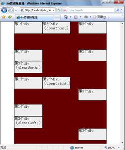 (2)为了更方便看到div的表现,笔者给内部div设置了浅灰色背景色和黑色边框,而外部的div为深红色背景色。在浏览器地址栏输入http://localhost/div_clear.htm,浏览效果如图11.10所示。