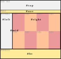 从分析图可以看出整个页面的结构,其中,#top代表广告区、#nav代表导航区、#mid代表主体区、#left代表#mid所包含的左区域、#right代表#mid所包含的右边区域、#bt代表版权信息区。