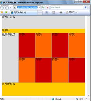 笔者稍微修改了XHTML部分的代码,选了4个具体内容区加上了id名称为content2的属性,这是为了使这4个区域有不同的背景色。在浏览器地址栏输入http://localhost/ div_page.htm,浏览效果如图11.13所示。