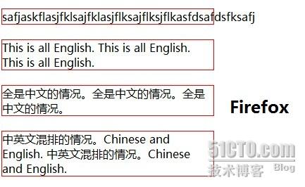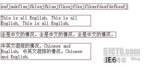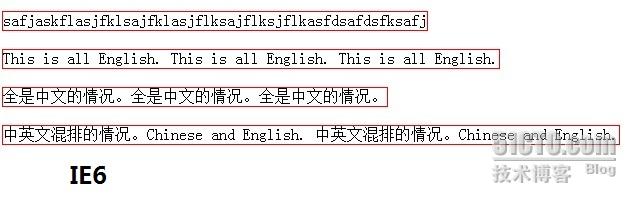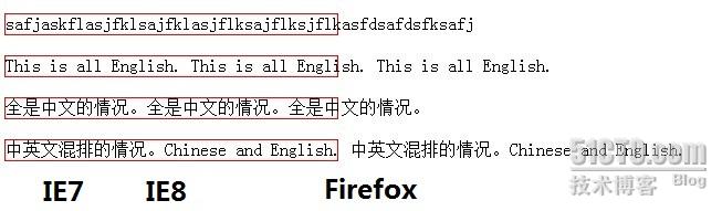 IE6下,英文长字符创和中文长句会撑开容器,IE7、IE8直接溢出,火狐下只有长英文字符串会溢出。