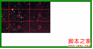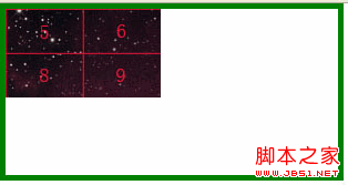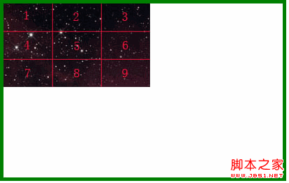 注:本文中使用的图片大小为 300px*120px,为了能很清晰的表达图形的哪部分被隐藏了,按照图片的大小平均分成了9等份。同时背景图片容器区域绘制出绿色边框清晰显示容器的范围。